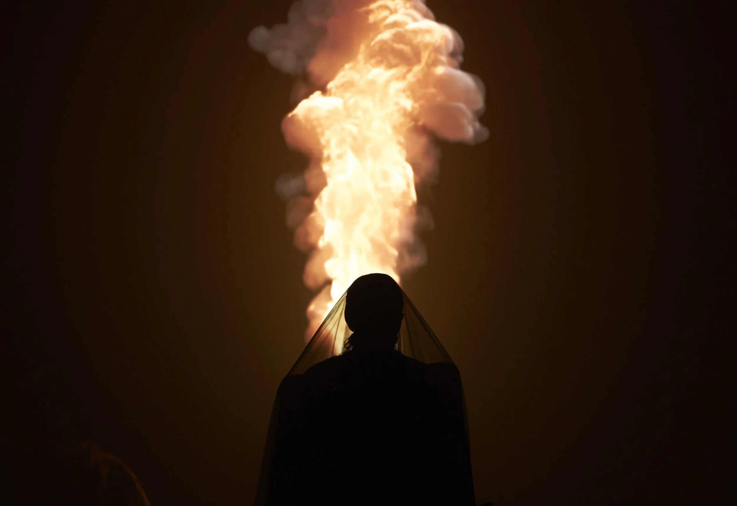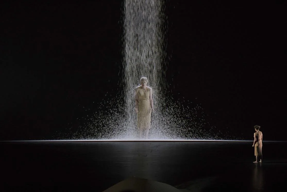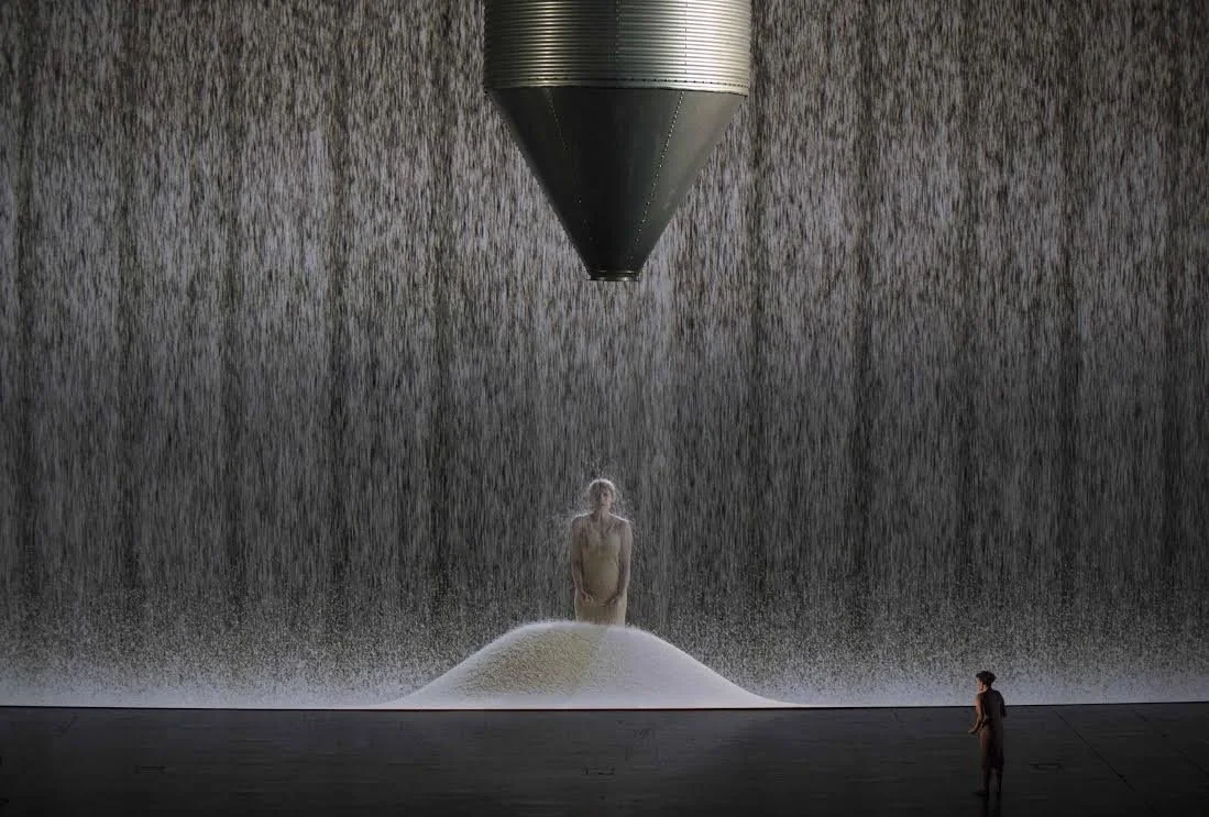 To create the work's principal image, soprano Jane Sheldon endured three tonnes of rice being dropped on her for over half an hour. The final 4K projected image was massive, at over 20 meters wide and 10 meters high.